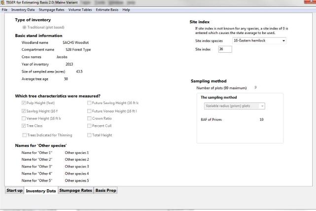 This page displays basic inventory information as shown on the Inventory prep page of TIGER for Woodlands and Compartments. Inventory data cannot be entered directly into TIGER for Estimating Basis. They are entered into TIGER for Woodlands and Compartments, saved in a file, and the file is read by TIGER for Estimating Basis. This is almost the same as the Inventory prep page in TIGER WC, except here the only thing you can change is the site index.