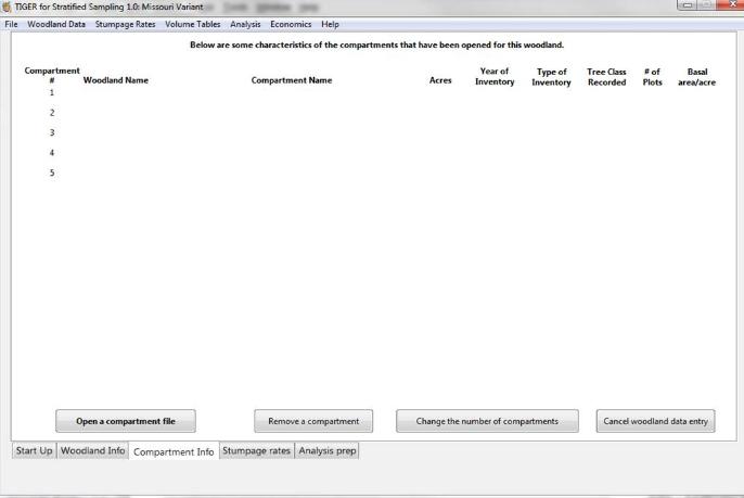 This page will be seen after clicking the "Start opening compartment data files" button on the Woodland Info window. As data files for compartments are opened, information on each compartment is displayed on the window.