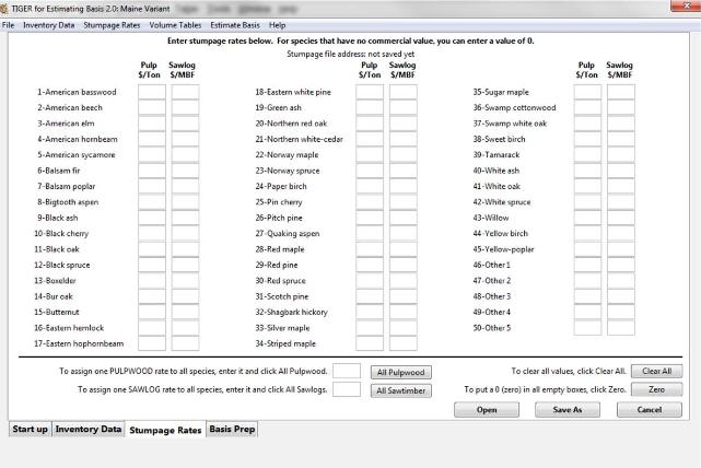 This page displays the form into which you enter stumpage rates. In this case pulp stumpage is in $/ton, sawlogs are in $/MBF, and veneer rates will not be entered. Stumpage rates can be for the year of the land purchase or for another year which will require that the values be adjusted for inflation or deflation.