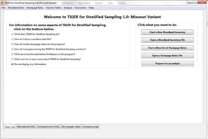 This is the start up screen for TIGER for Stratified Samplings. It allows you to initiate a few activities and presents some information about the operation of the program.