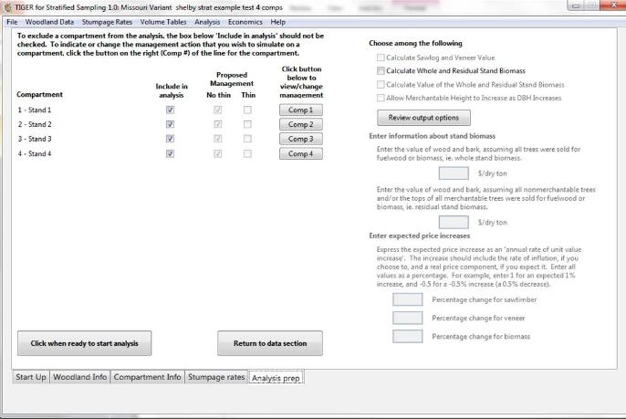 This page displays the window used to prepare for an analysis. Each compartment's name is listed on the left. A column of checked boxes below "Include in analysis" is used to have a compartment included or not. If you click the button near the middle, labeled like Comp 1, another window allows you to indicate the type of thin to be done.