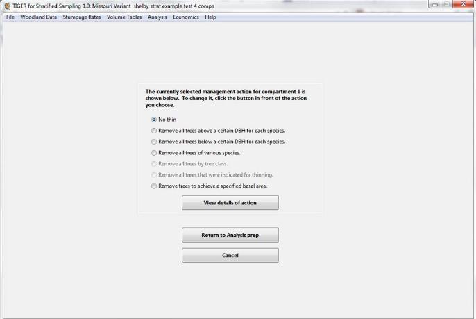 This page displays the window used indicate the type of thin to be simulated on a particular compartment. Depending upon the button clicked, you usually will see a window asking for more information. Those windows are identical to the windows for entering specific information about thins in TIGER for Woodlands and Compartments.