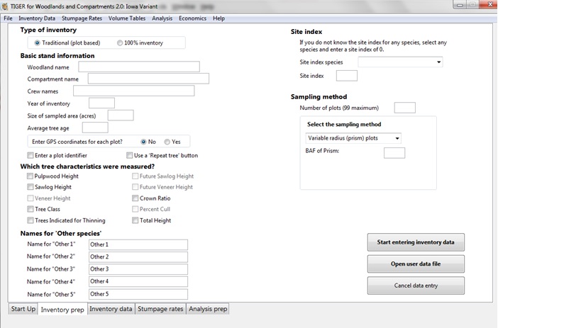 This page allows you to enter information about the inventory (traditional or 100%). You can indicate the type of information collected on each tree, type of sampling, etc. The page is set up for a traditional inventory. If you click the 100% sale prep button in the upper left hand corner, the page changes modestly for that type of inventory.