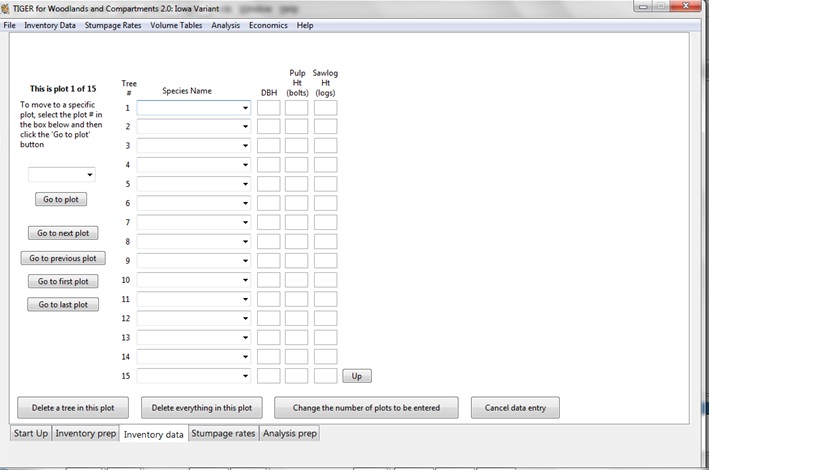 This page allows you to enter data one plot at a time for a traditional inventory. The page looks very similar for entry of 100% inventory data. The number of columns for data entry depends upon the number of tree characteristics that you indicate will be entered. The number of columns will vary, depending upon which characteristics of trees were measured.