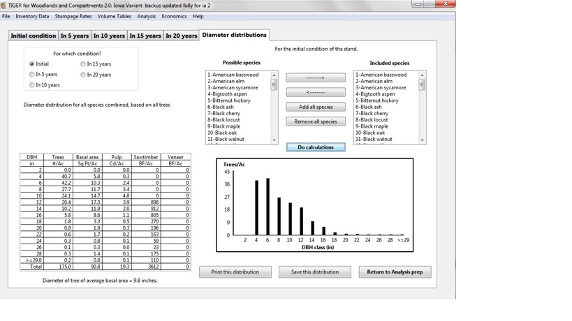 This page shows a diameter distribution that has been calculated from the results. Distributions for the initial condition of the stand and 5, 10, 15, and 20 years after the inventory was done can be calculated. Distributions can be done for one species, up to 10 species, or all species combined.