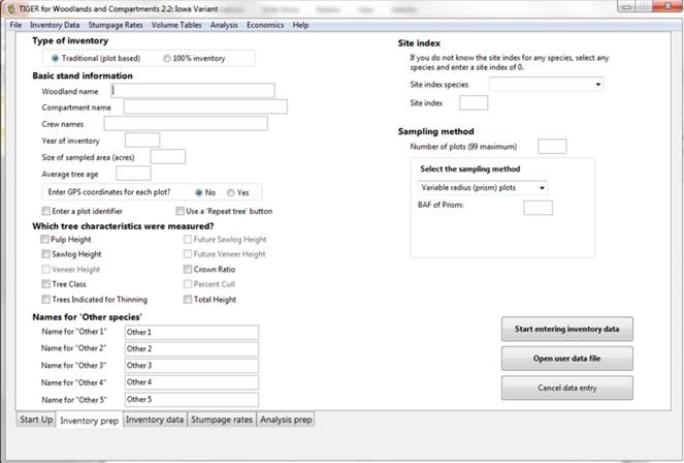 This page allows you to enter information about the inventory (traditional or 100%). You can indicate the type of information collected on each tree, type of sampling, etc. The page is set up for a traditional inventory. If you click the 100% sale prep button in the upper left hand corner, the page changes modestly for that type of inventory.
