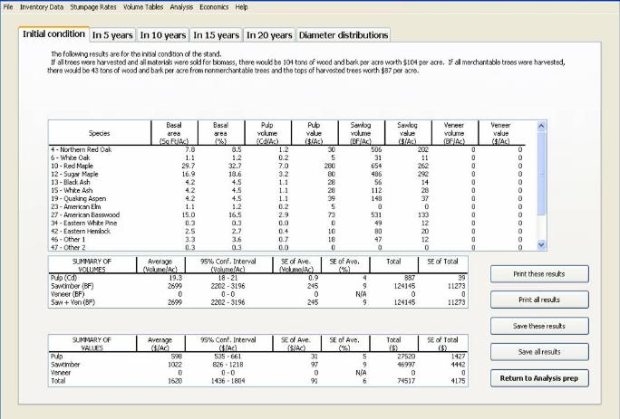 This page shows the results of a traditional inventory. By clicking on the tabs at the top of the page (when actually using the program but not here) you can see the simulated results 5, 10, 15, and 20 years after the inventory was done and calculate diameter distributions for any of the times.