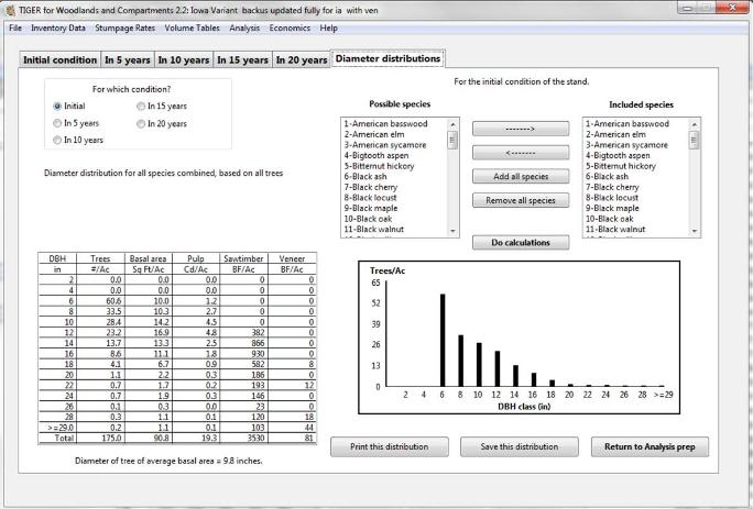 This page shows a diameter distribution that has been calculated from the results. Distributions for the initial condition of the stand and 5, 10, 15, and 20 years after the inventory was done can be calculated. Distributions can be done for one species, up to 10 species, or all species combined.