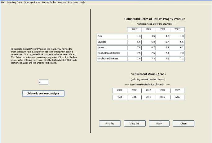 This page shows the results of an economic analysis done on an unthinned stand. TIGER does two types of